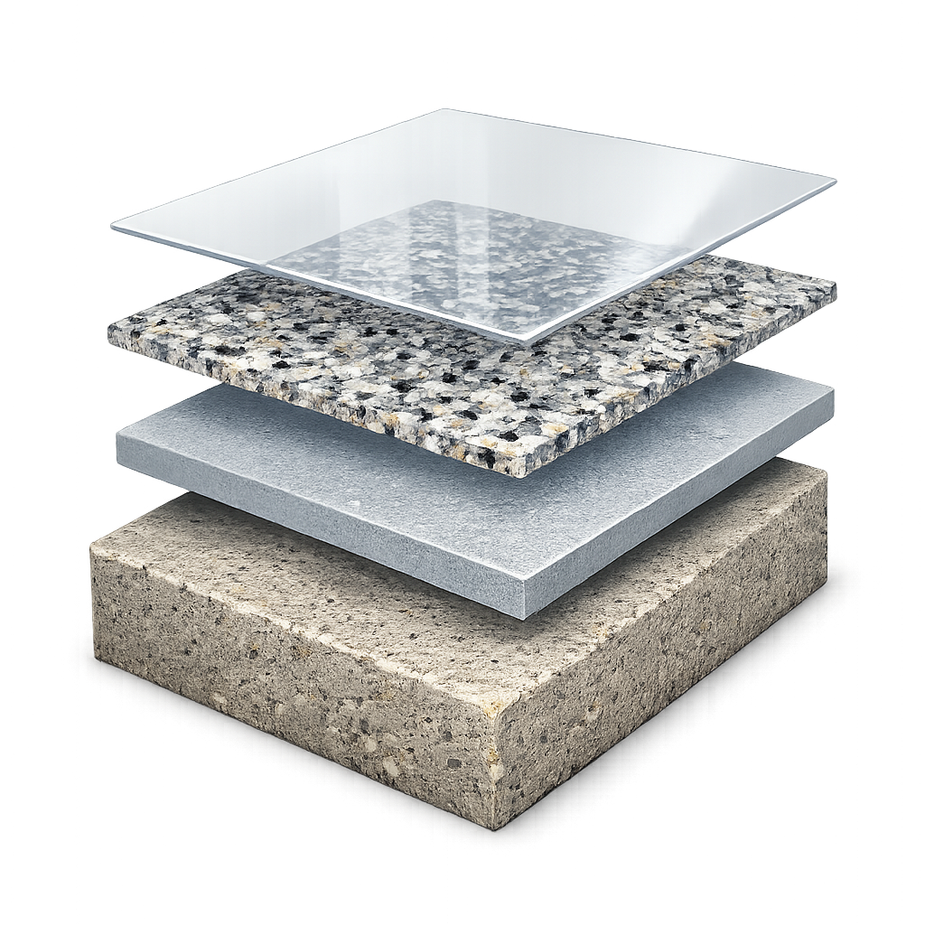 Our concrete coatings process is clean, efficient, and built for durability. We repair and prep the surface, grind it for strong adhesion, apply a premium epoxy or polyaspartic base coat, add decorative flakes, and finish with a UV-stable polyaspartic topcoat. The result is a beautiful, long-lasting surface that’s ready to use in as little as one day.